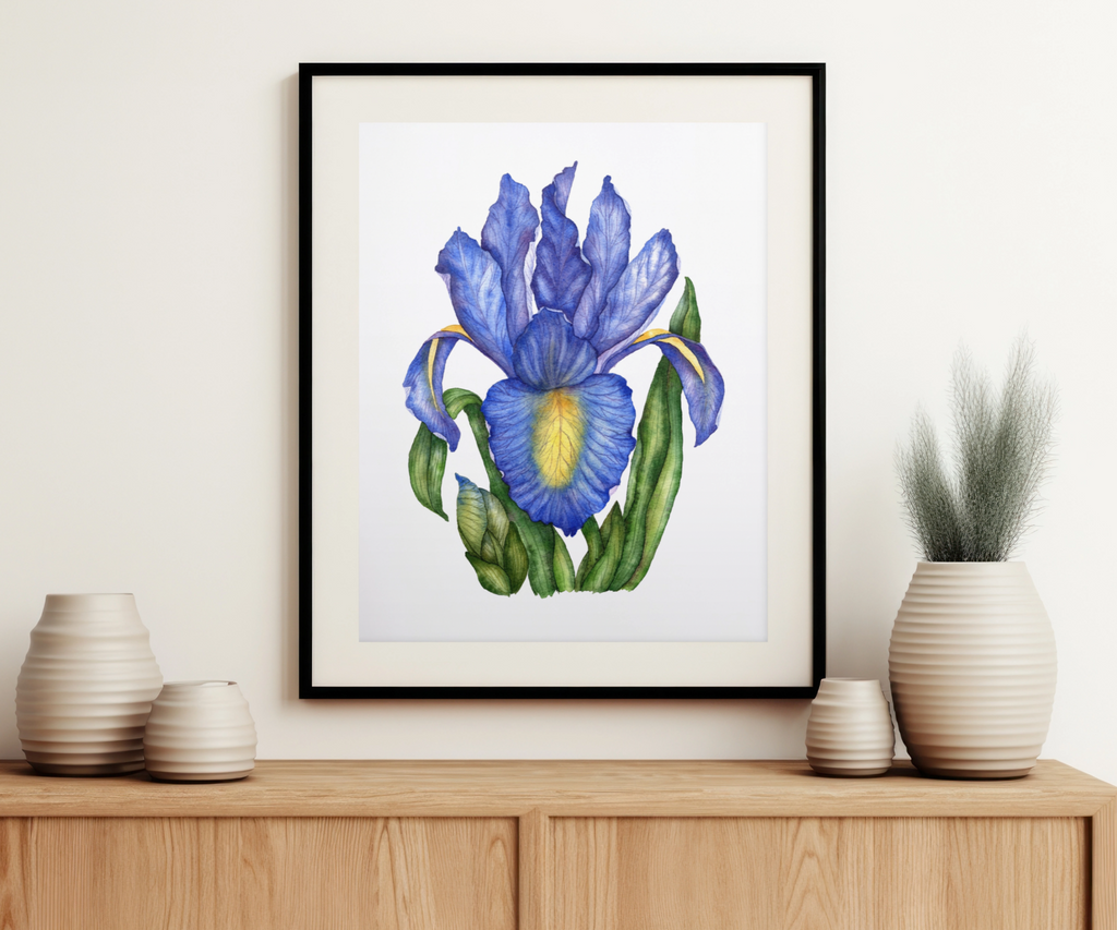 This high-quality art print features a watercolour illustration of a blue iris flower from my collection of original watercolour paintings.